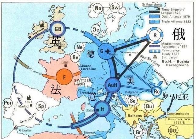 因而在德国的撮合下,英国、意大利、奥匈帝国签订了地中海协定,核心是反法和反俄,此后西班牙也加入地中海协定,法国的周围都是敌人,法国被德国孤立起来。德、奥、意又搞了个三国盟国,反法反俄目的在于孤立法国,把沙俄拉到德国一边,德国又和奥匈、罗马尼亚建立同盟,意思很明显,你沙俄周围都是反俄的,奥匈反俄、英国反俄、罗马尼亚反俄、我的盟友意大利也是反俄的,你沙俄如果不和我友好去法国那边,我德国也会反俄,沙俄由此和德国签订了再保险条约,在德法战争保持中立。